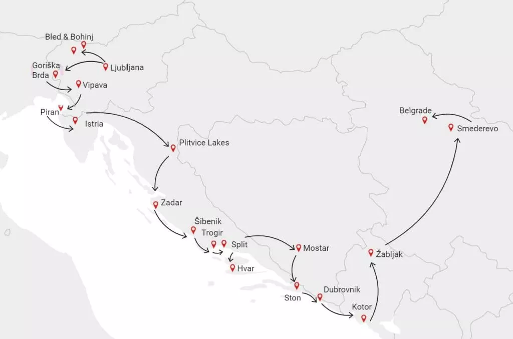 Lähestyessäsi Slovenian rannikkoa, joka kuuluu Istrian alueeseen, huomaat myös, että kuten Kroatiassa, saamme enemmän Välimerellisiä vaikutteita, niin ruoassa kuin Slovenian upeissa viineissä. Slovenian merituuli valmistaa sinut Kroatian kiertomatkalle. Istriasta Dalmatiaan Kroatia on kuuluisa kauniista rannoistaan ja upeista sinisistä meristään, jotka ovat koti monille herkullisille kaloille. Saat nauttia upeista, tuoreista merenantimista ja näet myös, kuinka lihapitoiset Balkanin tendenssit on sisällytetty kevyempään Välimeren ruokavalioon. Kroatialaisen seikkailusi aikana hyppäät myös Bosnia ja Hertsegovinaan päiväksi, saadaksesi maistiaisen herkullisesta turkkilais-balkanilaisesta keittiöstä Mostarissa.