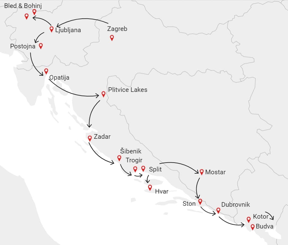 This dozen-day Balkan trip gives you a little bit of everything, for a well-rounded exploration of the western Balkans. Our tour of Croatia, Slovenia, and Bosnia & Herzegovina, as well as Montenegro, will take you on a Balkan travel experience full of beautiful cities, incredible nature, and heavenly beaches.
