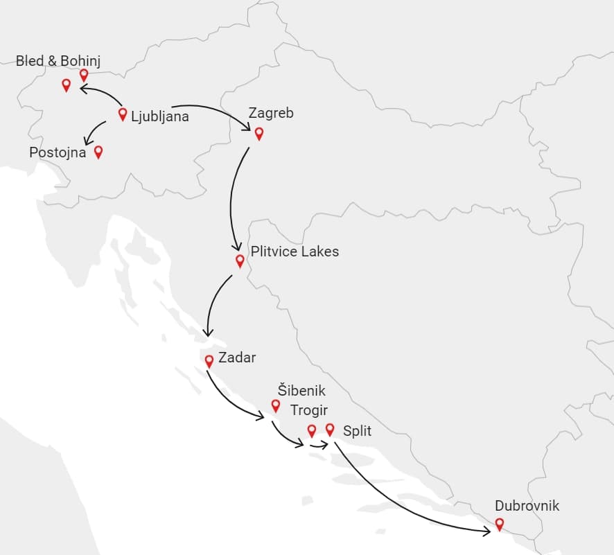 Bli med oss på en ukelang Balkanferie til Slovenia og Kroatia, den korteste av Balkan-reiser og turer, og få en omfattende omvisning i de to landene. Fra fjellrike Triglav nasjonalpark og livlige hovedsteder til spektakulære kystbyer langs Kroatias kystlinje, vil uken din være over på et blunk, men minnene fra de fantastiske stedene du besøker vil være med deg for alltid.